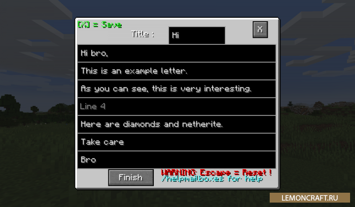Мод на почтовый ящик Mailboxes добавляет в игру новый блок с помощью которого вы сможете обмениваться со своими друзьями письмами и даже помещать в него различные предметы. Для начала вам нужно создать письмо, потом кликнуть на нем ПКМ и отредактировать, после этого сохраняете созданное письмо нажав крестик. Для отправки письма используется команда /sendletter . После этого данное письмо будет доступно вашему другу в его почтовом ящике.